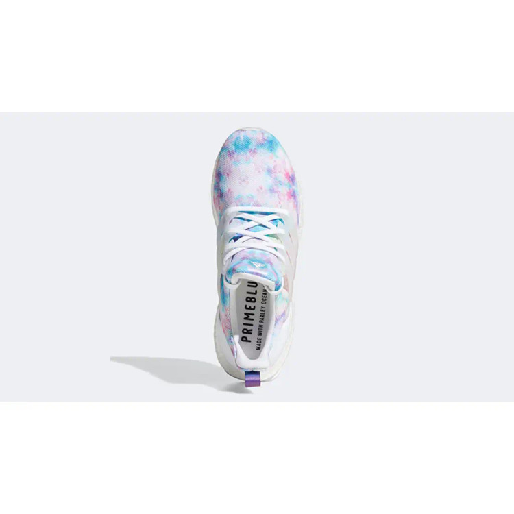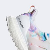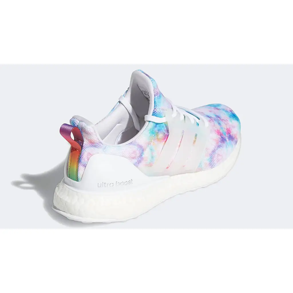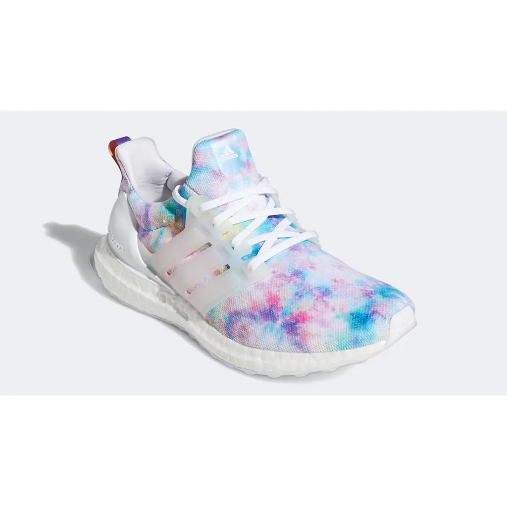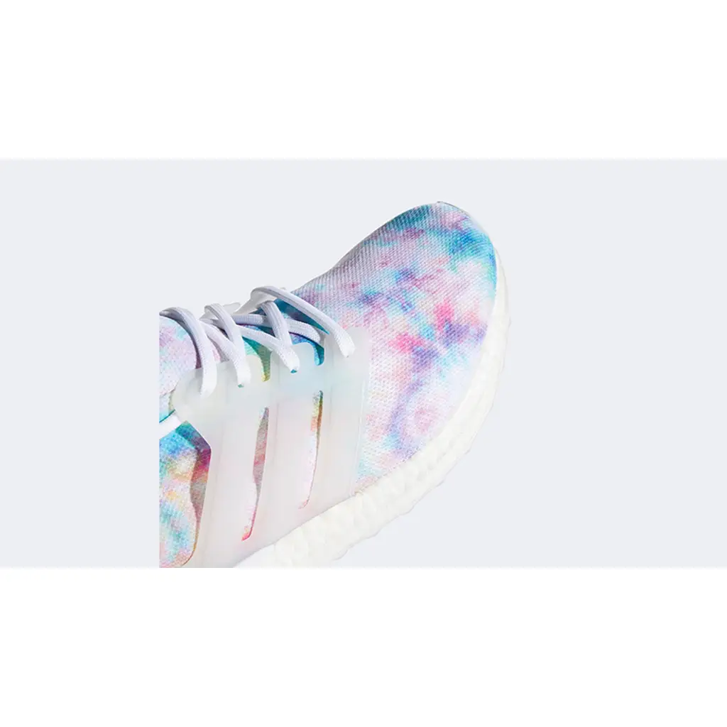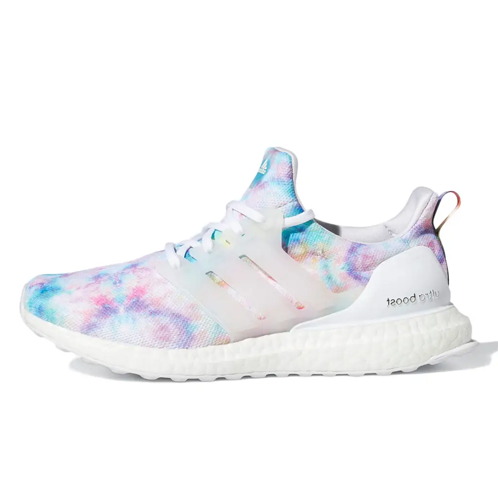 • این مدل یک کفش زنانه UltraBoost 4.0 DNA از برند Adidas است با طراحی «تایدای» (tie-dye) رنگارنگ که ظاهر بسیار زنده و تابستانی دارد.
